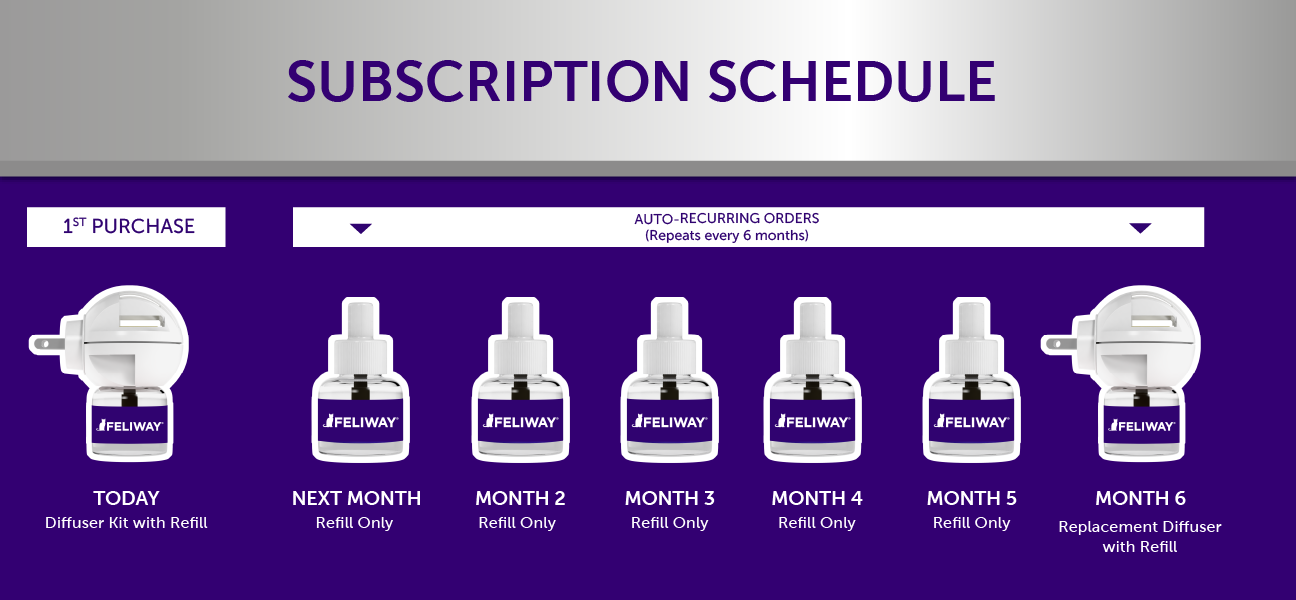 Please Note: The reoccurring refills you receive will correspond with the FELIWAY® Diffuser kit you purchased. Ex: If you ordered a FELIWAY® Optimum Diffuser Kit, you will receive a FELIWAY® Optimum Refill.